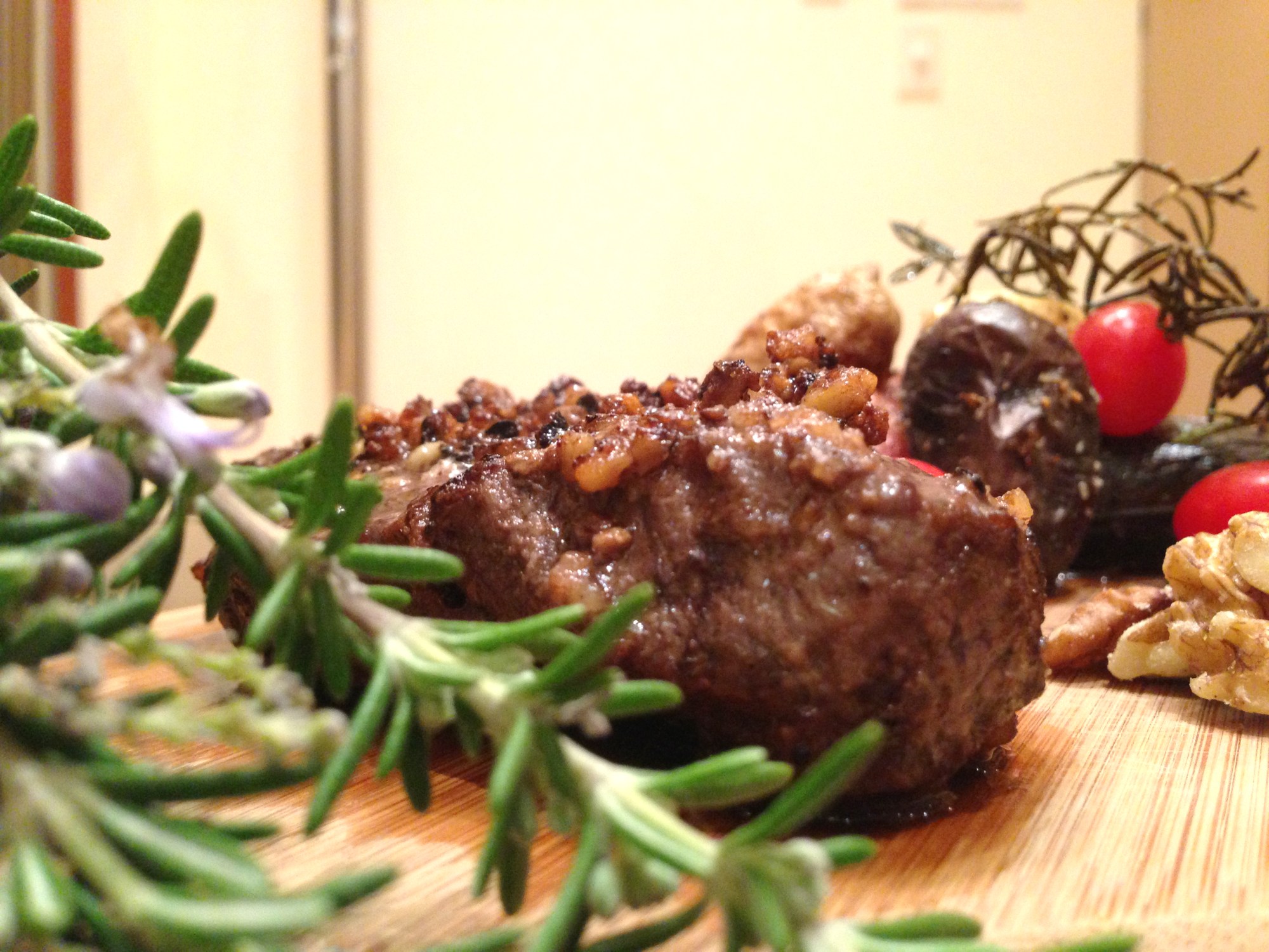 - Lay crushed walnuts on plate. Place filet on plate and press down until one side is completely covered with walnuts.