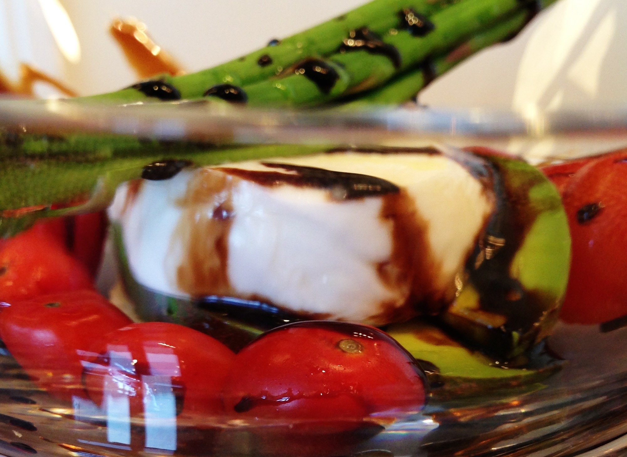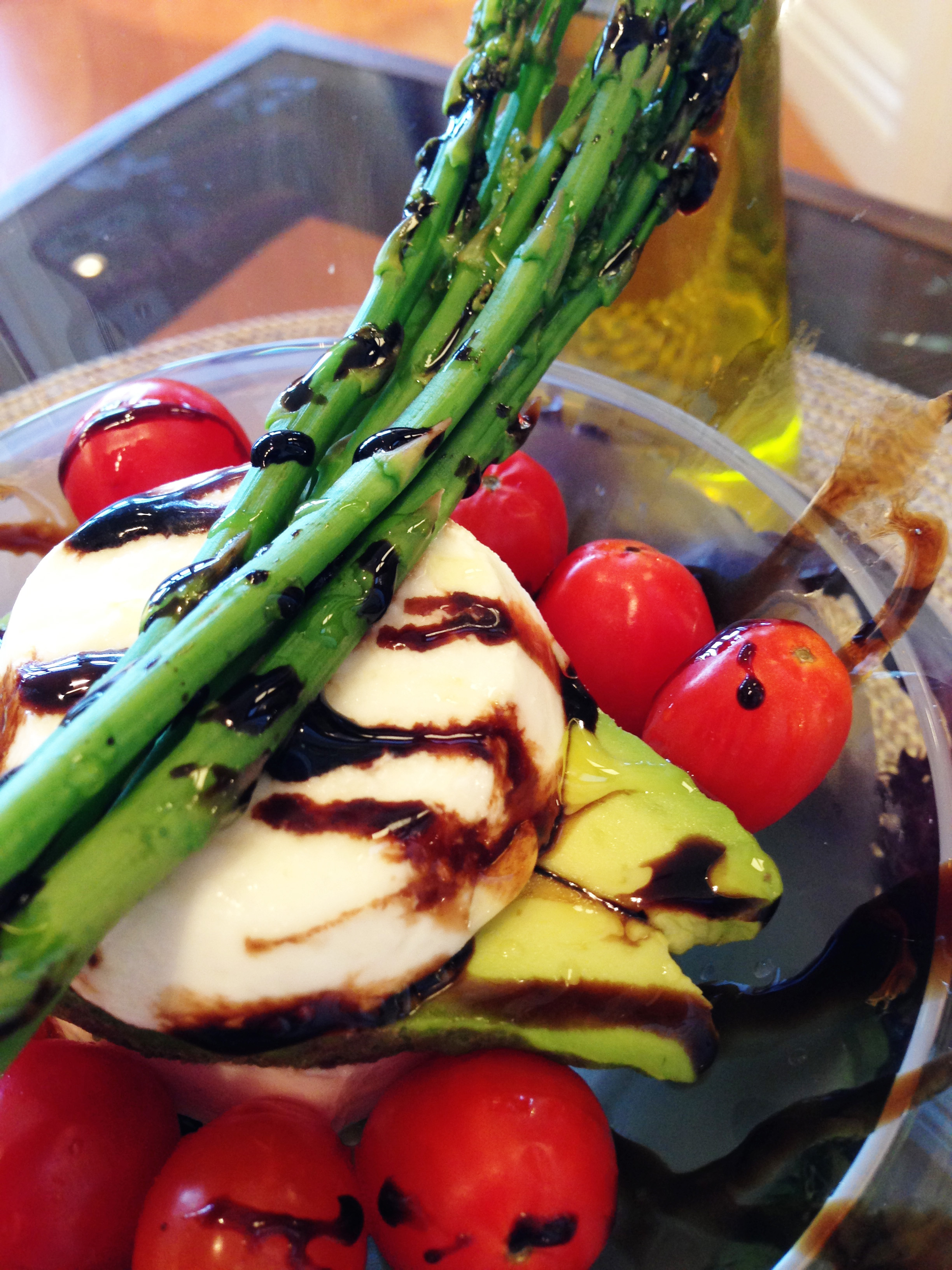 - Top salad plates with asparagus spears. Finish off by drizzling 1 tbsp. of thick balsamic vinaigrette, followed by 1 tbsp. of olive oil.