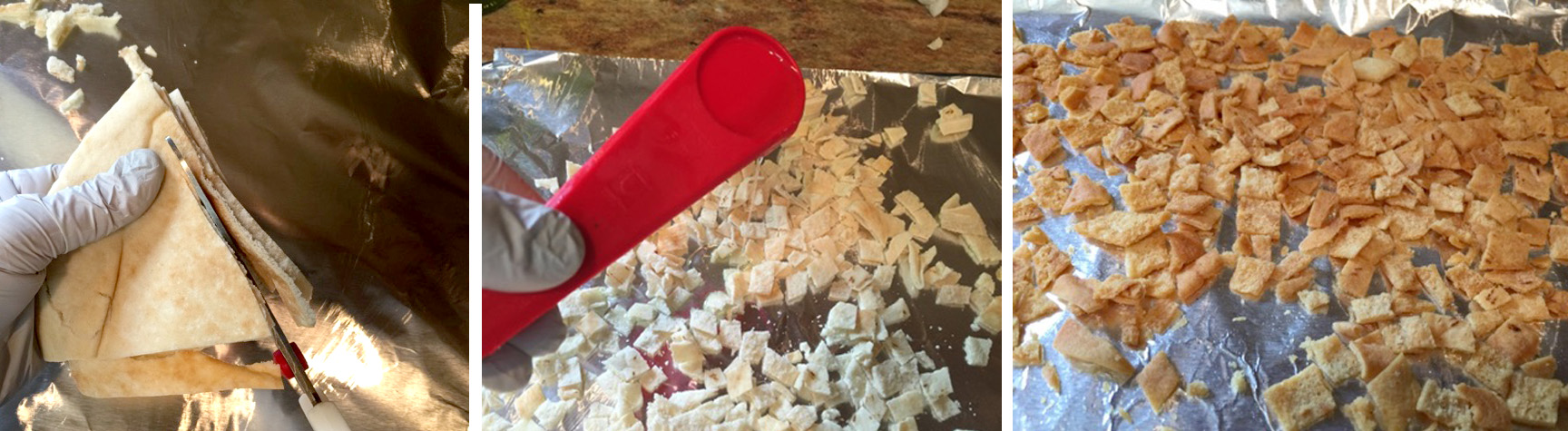 - While this is cooking, cut your pita bread into 1-inch square pieces. Add to a baking sheet along with remaining tablespoon of peanut oil & bake for 10-15 minutes or until golden brown. Reserve for garnish.