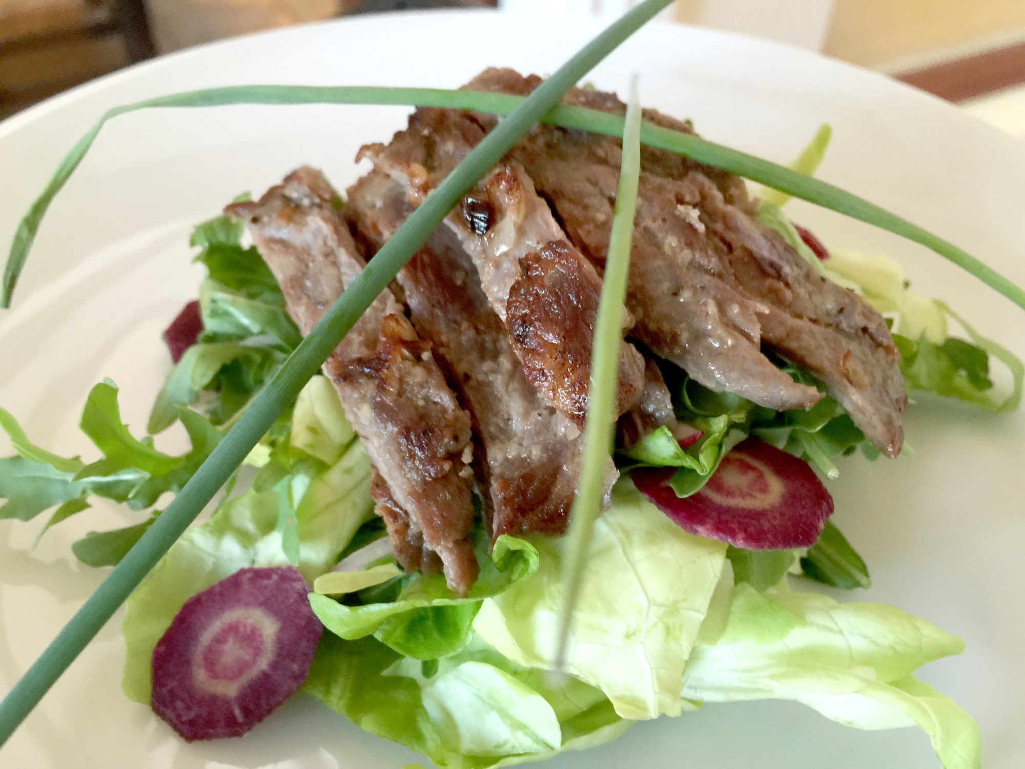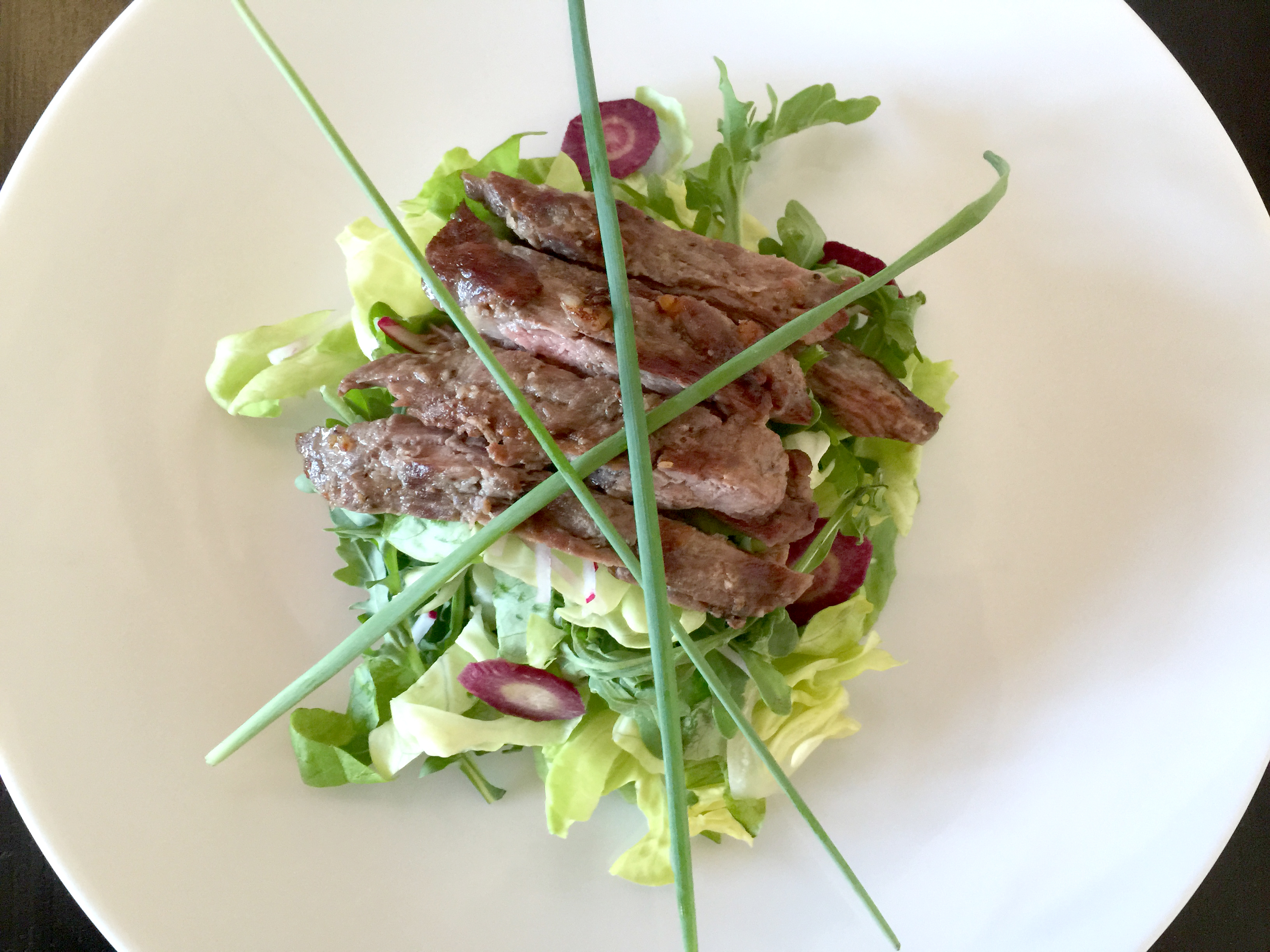 - Cut each piece of steak into strips 3-4 pieces and serve on top of salad mixture. Top each plate with vinaigrette and serve.