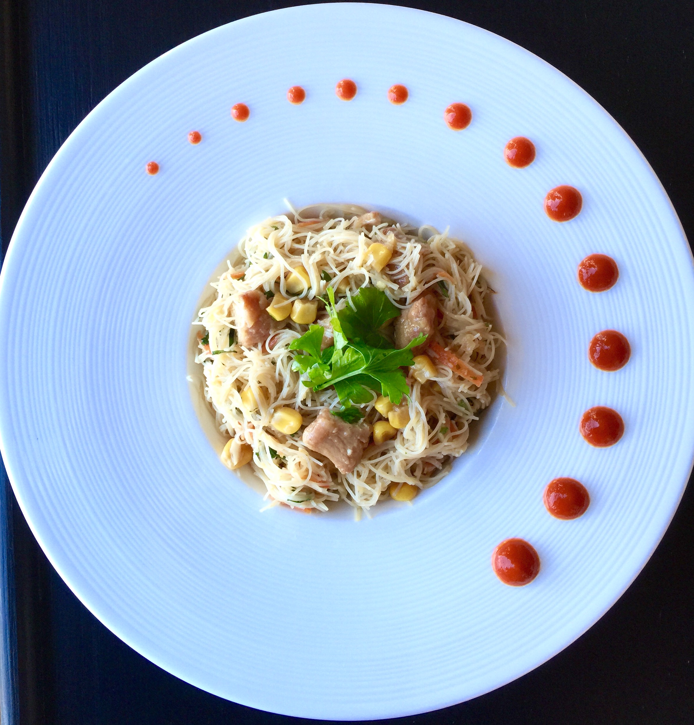 - Mix sauce into chicken rice noodle salad, garnish with cilantro & sriracha as pictured, and serve. Best served cold or at room temperature.