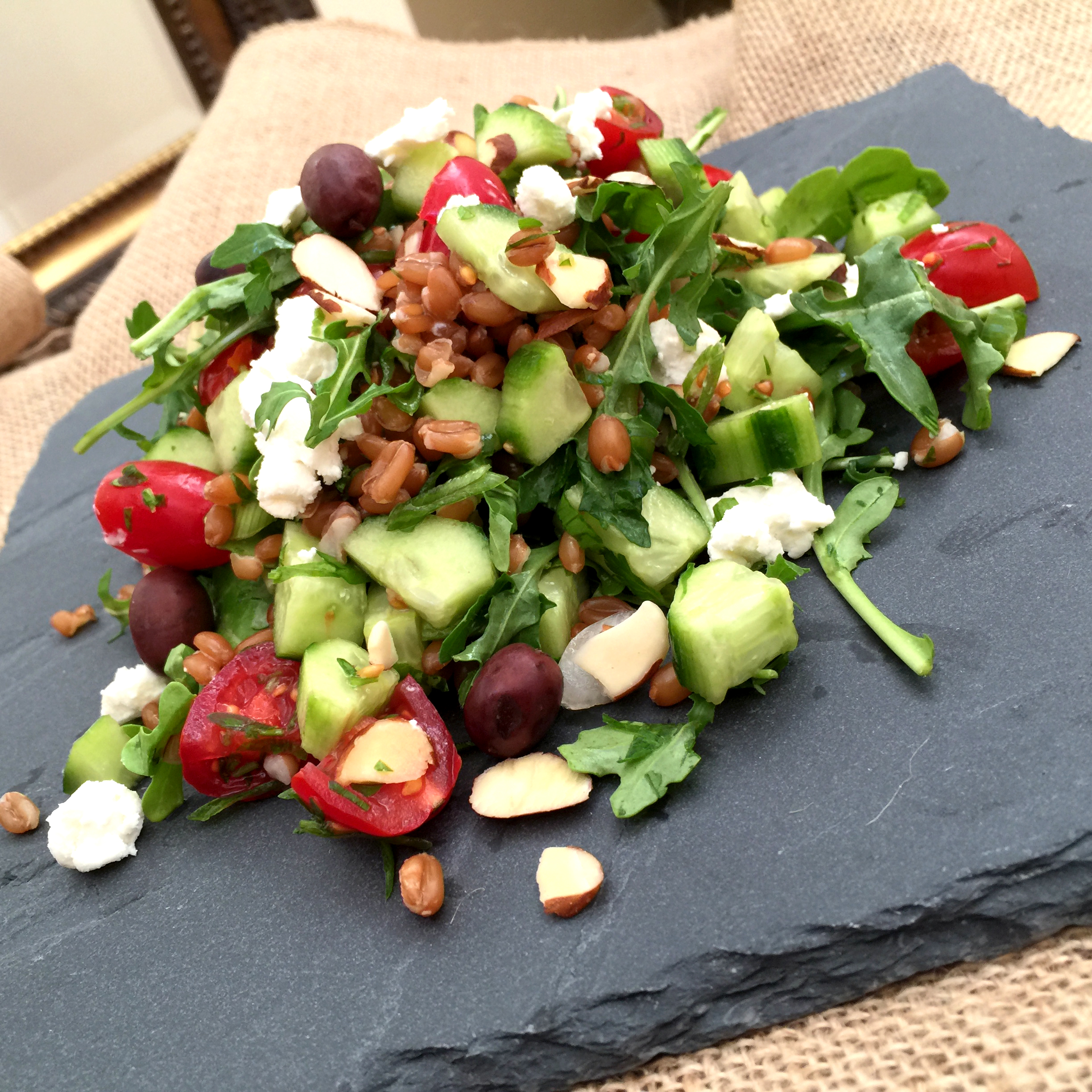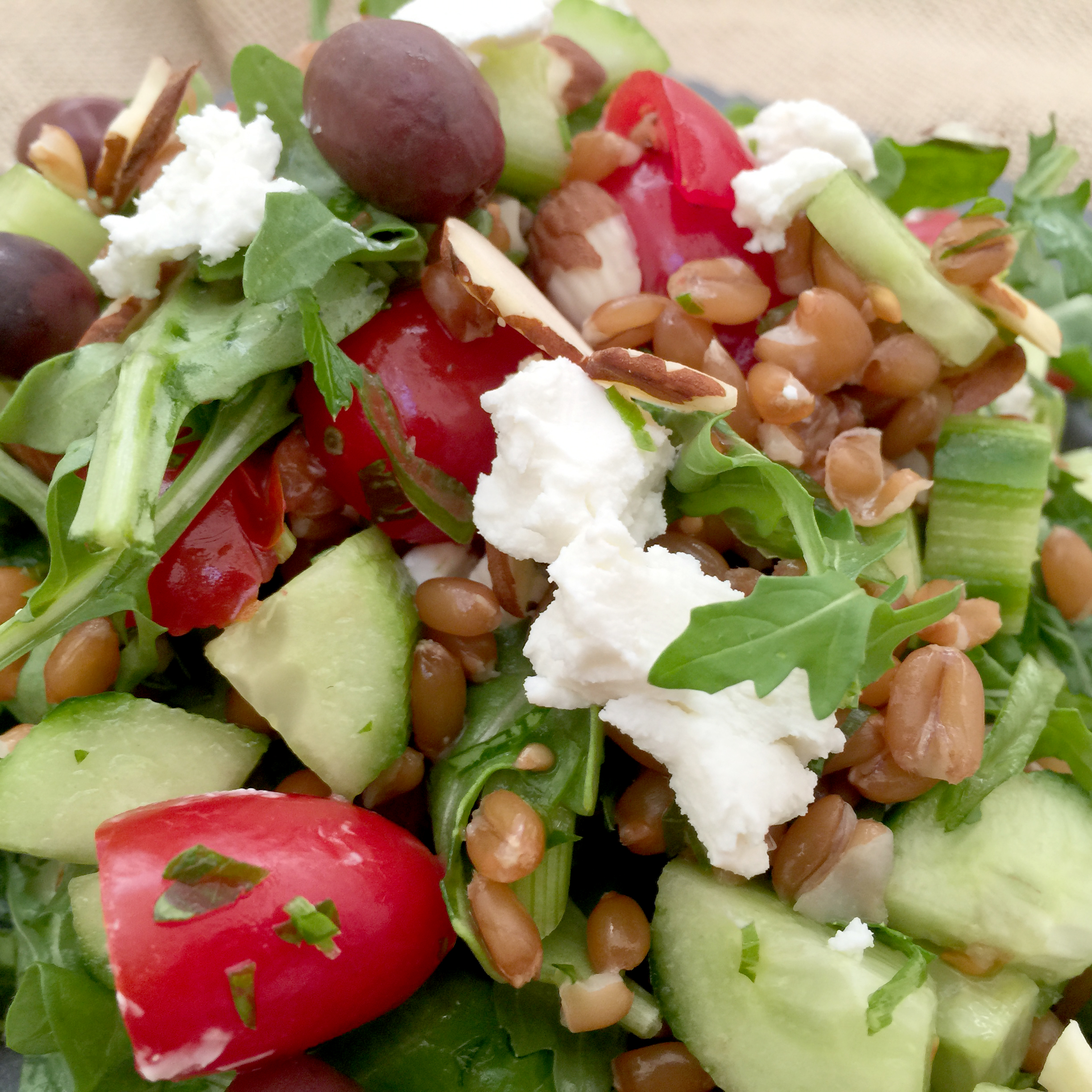 What are spelt berries you ask? Spelt berries, or spelt is a nutty whole grain that is high in fiber and plant-based protein. It’s absolutely delicious in various dishes, especially salads such as this. With fresh ingredients such as lemon juice, parsley, tomatoes, and olive oil, this dish resembles the middle-eastern dish ‘tabbouleh’ but incorporates spelt berries along with creamy goat cheese and crunchy, sliced almonds. Bon appétit, ladies and gentlemen.