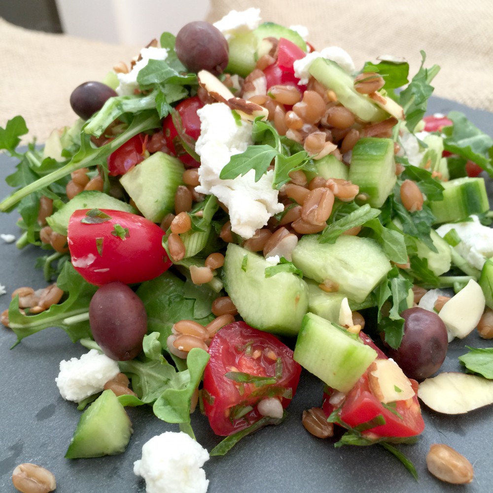 - Add spelt berries to salad and drizzle dressing over salad & toss well to coat. Stir in cheese and garish with sliced almonds and nicoise olives.
