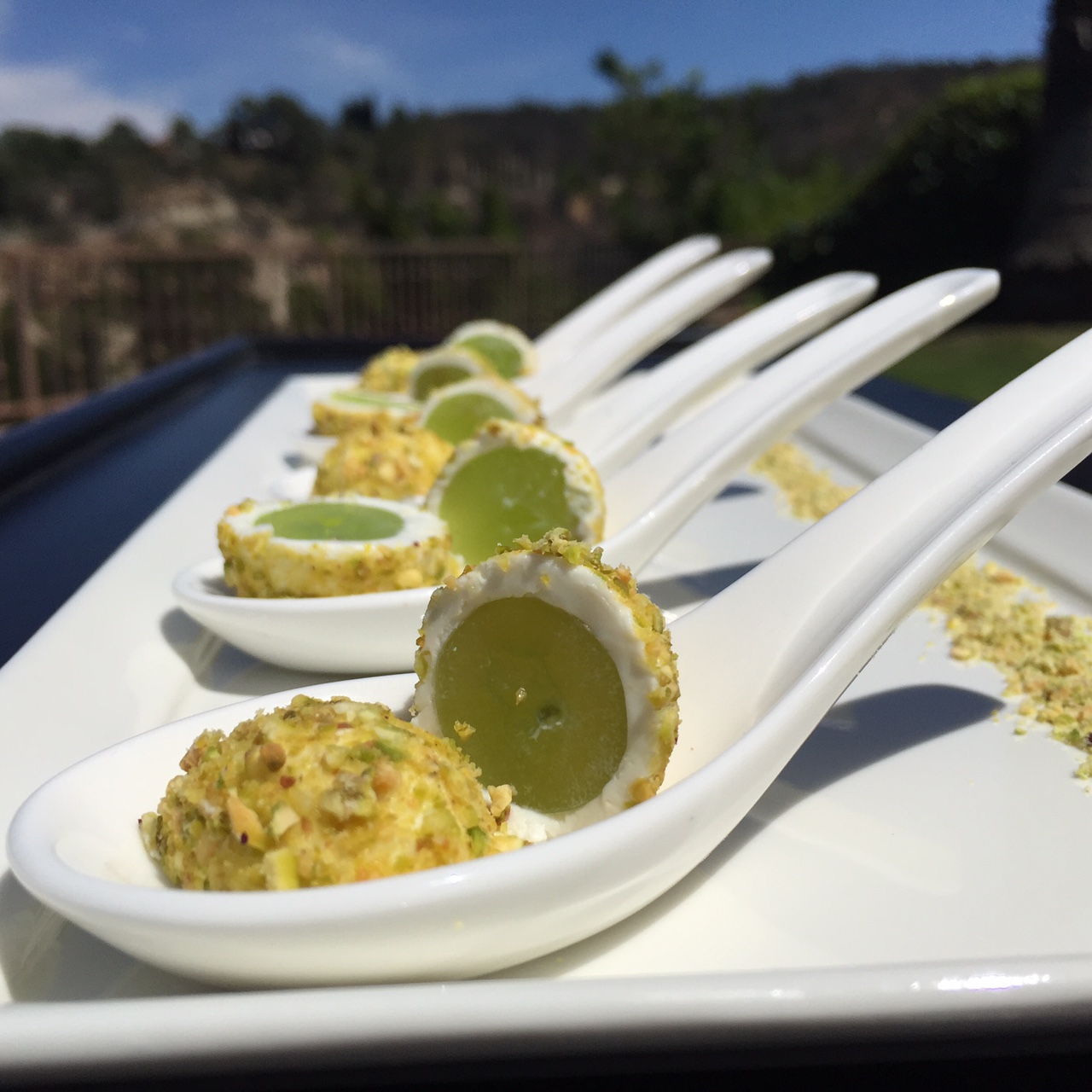 - Take a small piece of goat cheese and make a 1-inch diameter ball. Squash the goat cheese around each grape until an even layer is formed around grape.