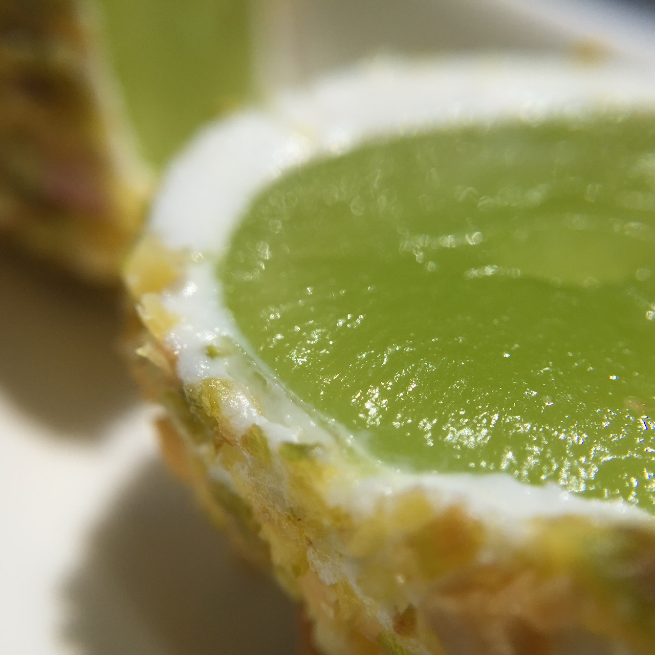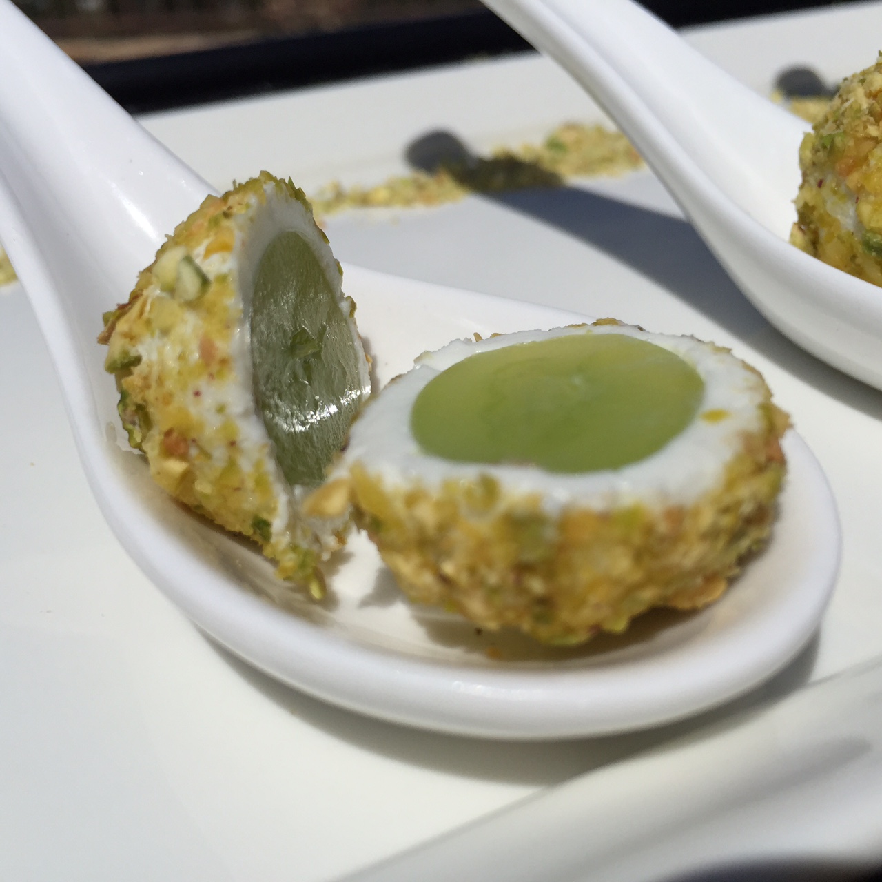 - Roll goat cheese crusted grape in pistachio until it is evenly coated.
