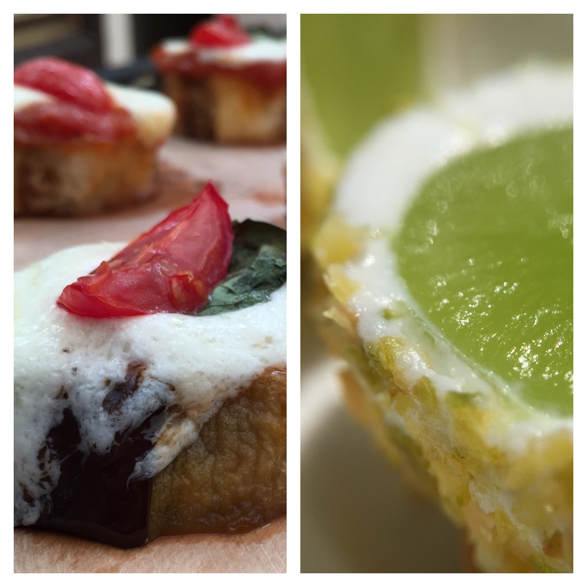 - Top each eggplant pizzette with a tomato slice & small basil leaf.