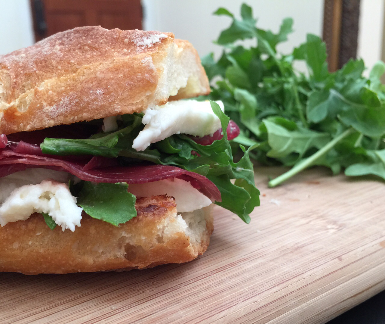 - Now begins the layering! On each baguette, start with a layer of arugula, followed by 4 slices of bresaola, 1 ounce mozzarella, 6 halved cherry or grape tomatoes & a final layer of arugula. Top with a squeeze of lemon & close sandwich. Alternatively, you may serve this open-faced.