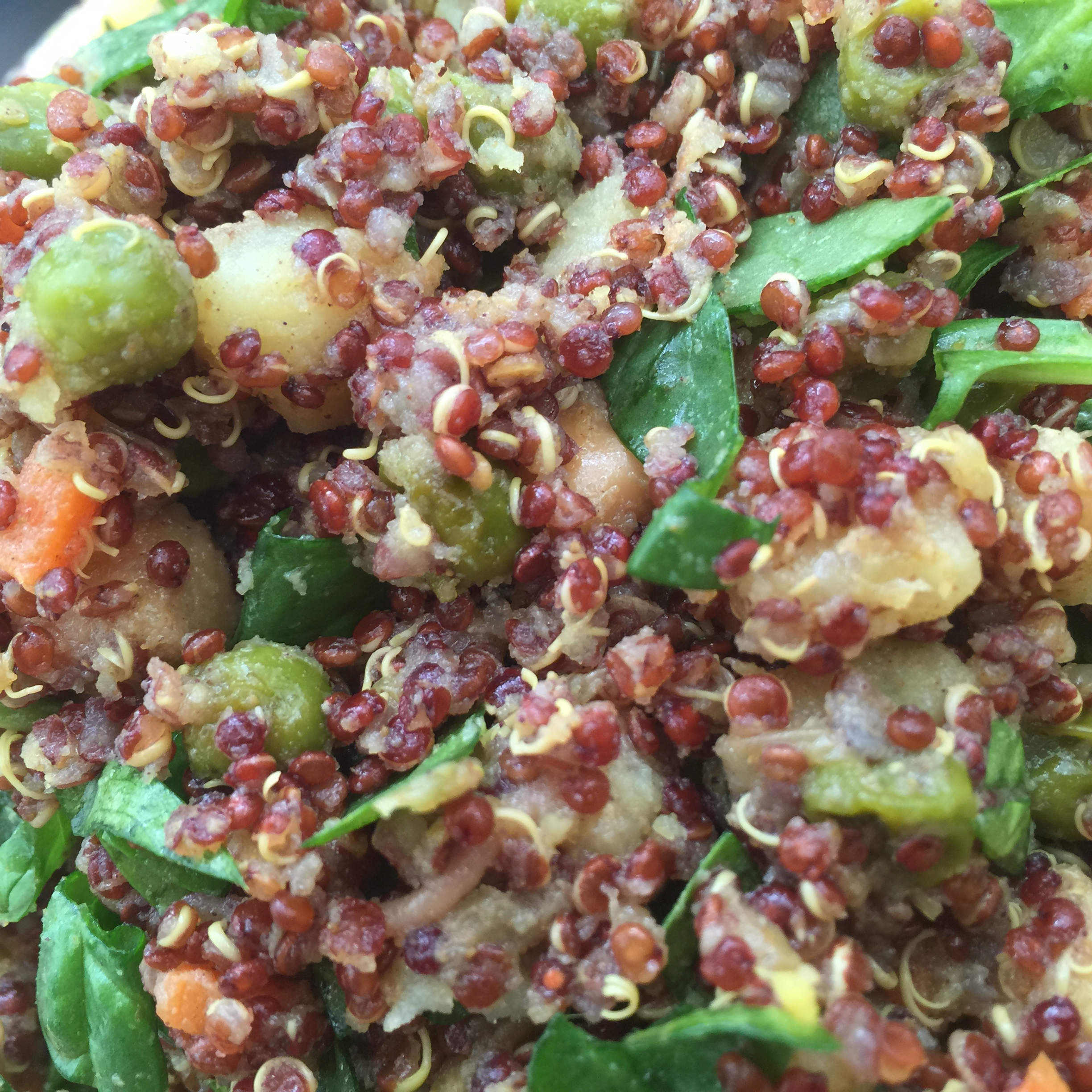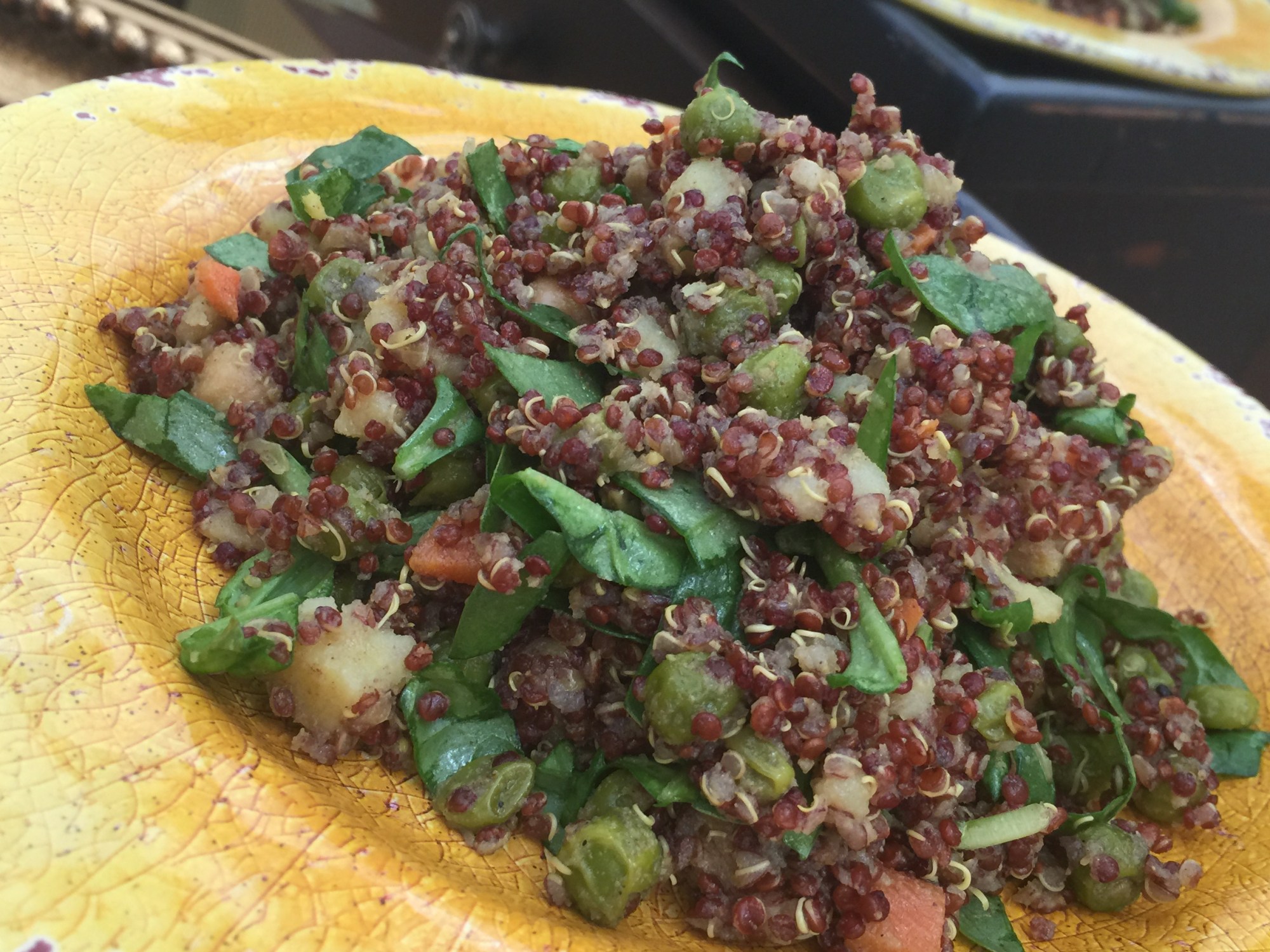 - Add the quinoa to the sauté pan with the chickpea mixture. Add remaining ¾ cup vegetable stock and continue to simmer on low heat for 5-10 minutes until water is absorbed but quinoa is still moist. Add spinach (it will wilt a bit). Add cinnamon, season with salt and pepper, and serve piping hot.