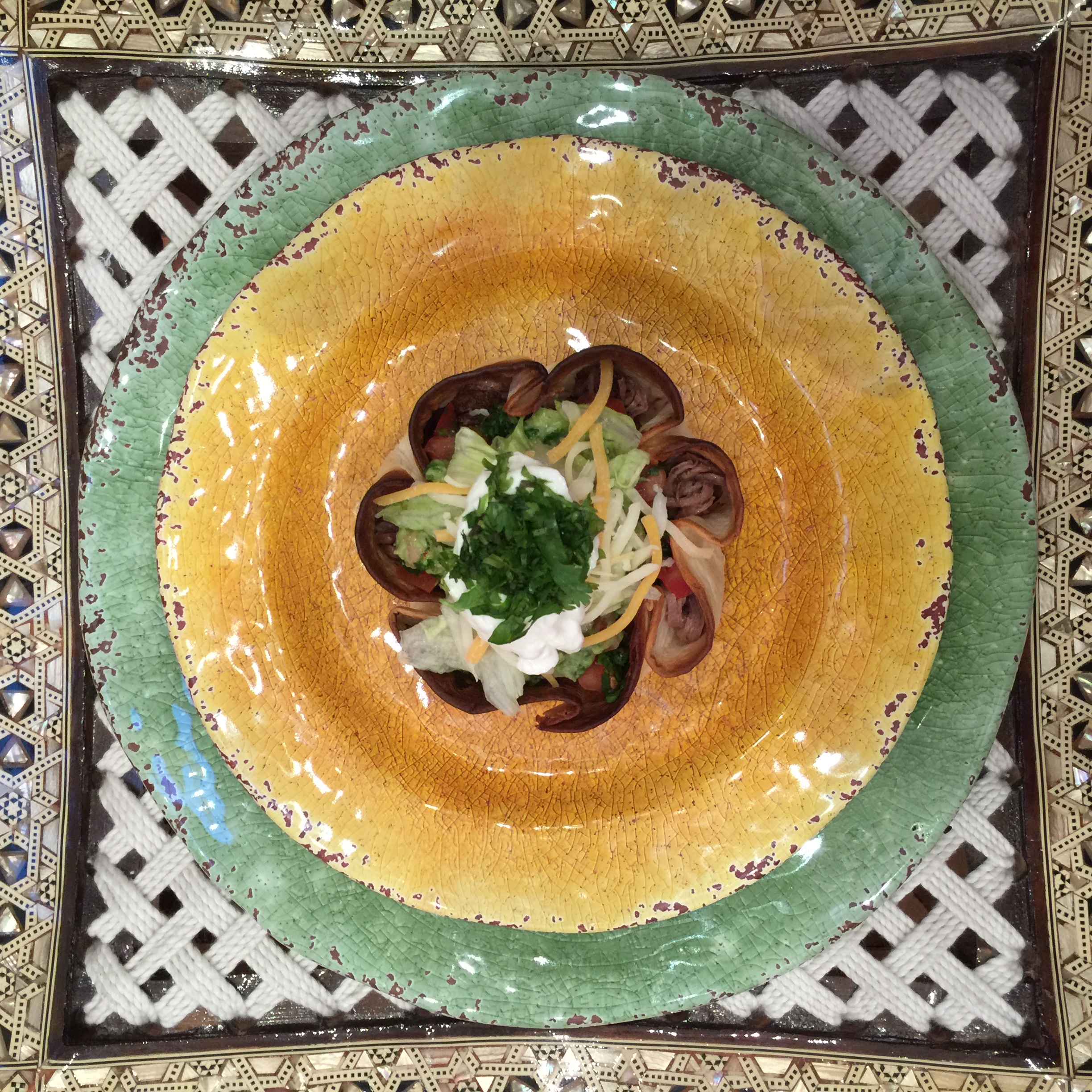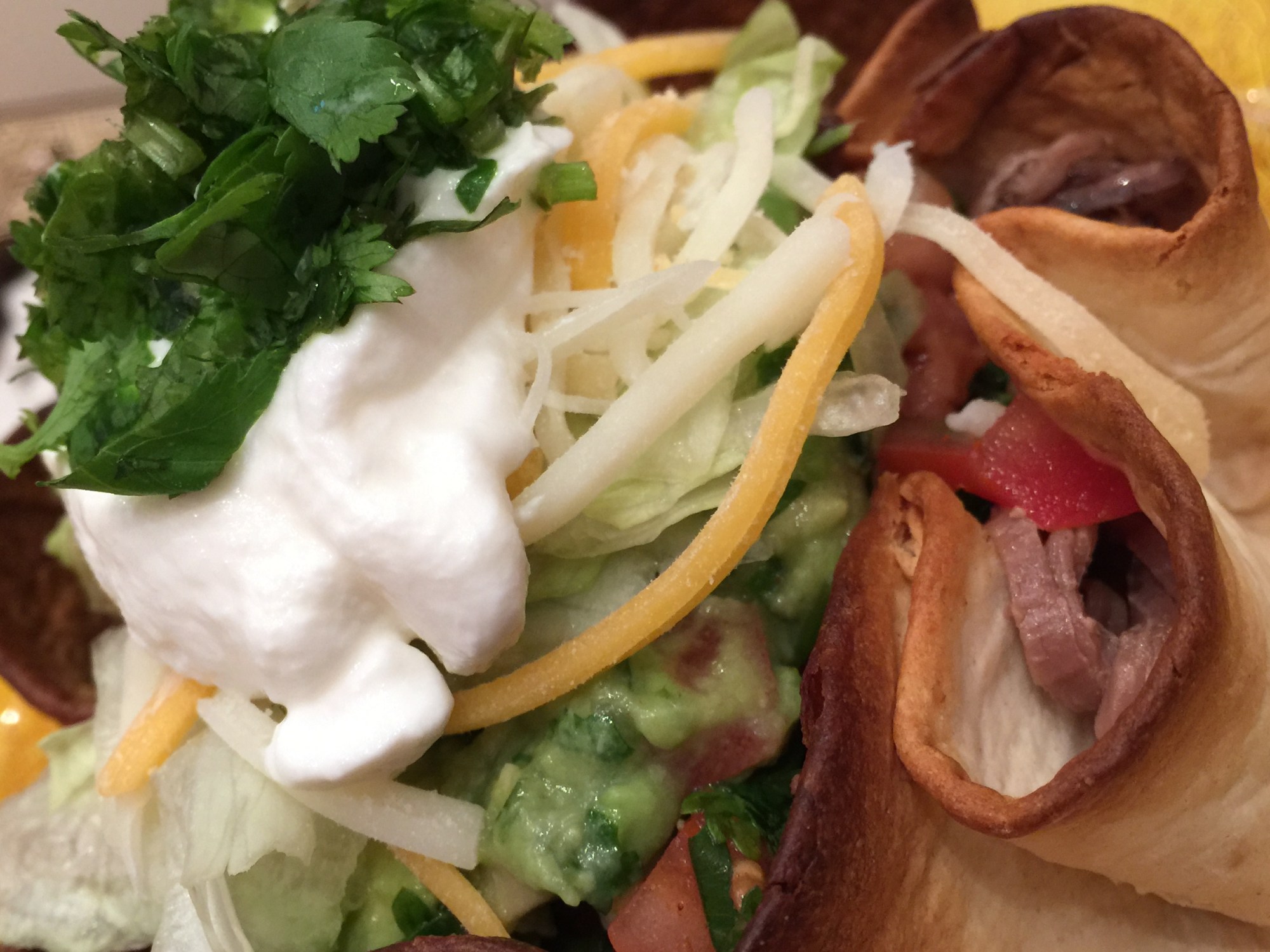 - To prepare the tortillas, place in a muffin tin & spray with cooking spray. Twist tortilla to create shape as pictured above, if desired. Bake in preheated oven for 7 minutes or until brown.